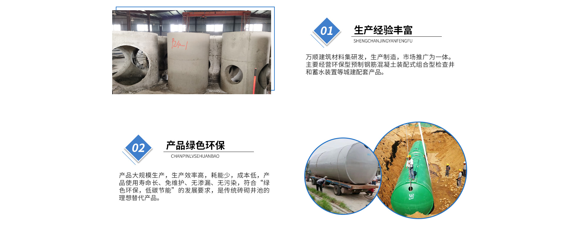 黃山市萬順建筑科技有限公司是集研發(fā),生產制造,市場推廣為一體的綜合性企業。公司主要經營環(huán)保型預制鋼筋混凝土裝配式組合型檢查井和蓄水裝置等城建配套產品。產品生產過程采用獨特的生產工藝,機械化流水作業。產品大規(guī)模生產,生產效率高,耗能少,成本低,產品使用壽命長、免維護、無滲漏、無污染,符合“綠色環(huán)保,低碳節(jié)能”的發(fā)展要求,是傳統磚砌井池的理想替代產品。